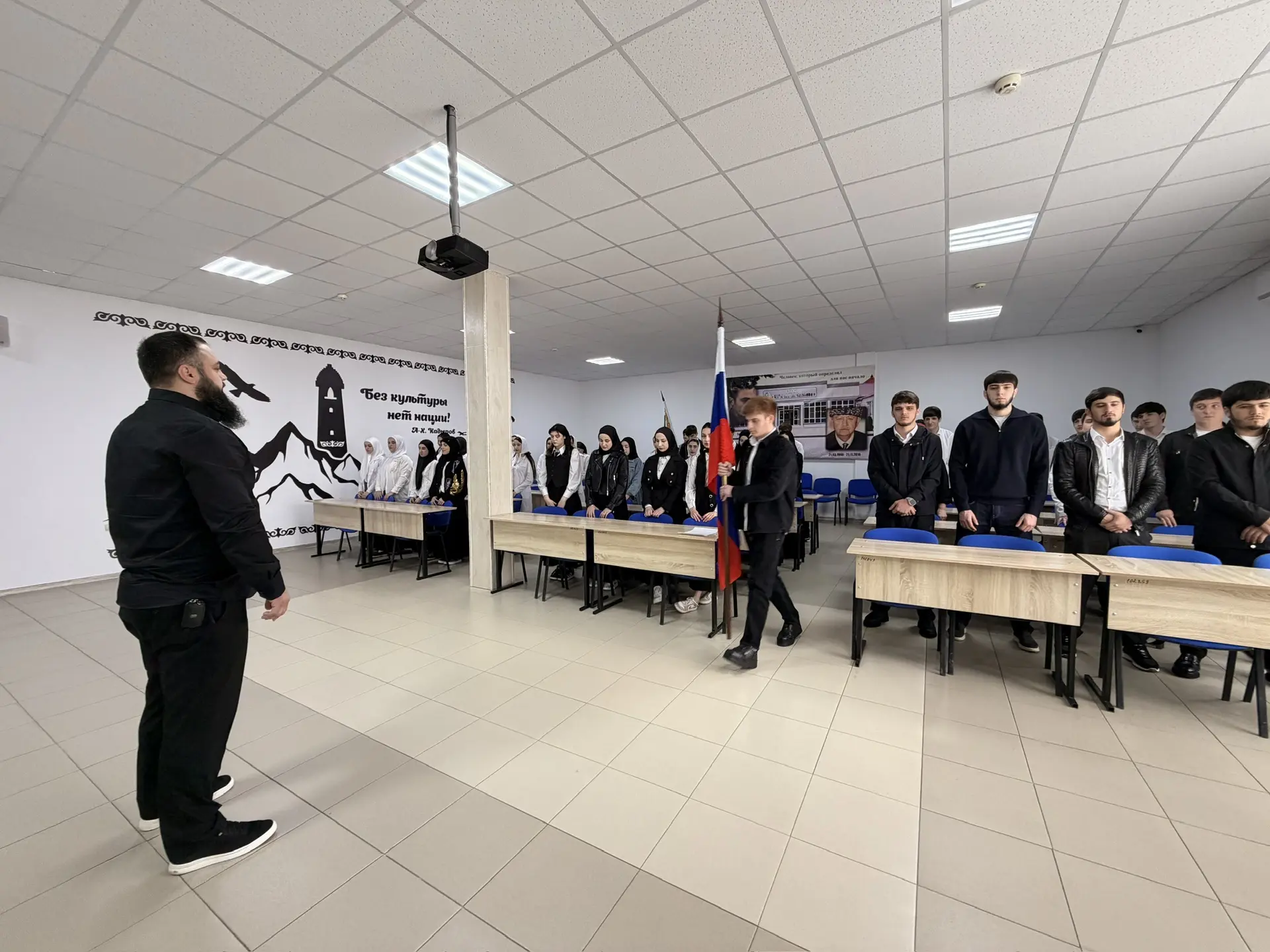 30.03.202630 марта в ГБПОУ «КГК им. Ш. Калиева» состоялась еженедельная патриотическая акция церемониального выноса флагов РФ и ЧР и исполнения гимна РФ и ЧР.На церемонии присутствовали студенты, преподаватели и сотрудники колледжа.Особая честь выноса и установления флагов выпала студентам: Хусиханову Халиду и Бициеву Абдул-Малику.После церемонии студенты отправились на внеурочное занятие "Разговоры о важном". Его темой стал важный для всех возрастов вопрос «Как справляться с волнением?».