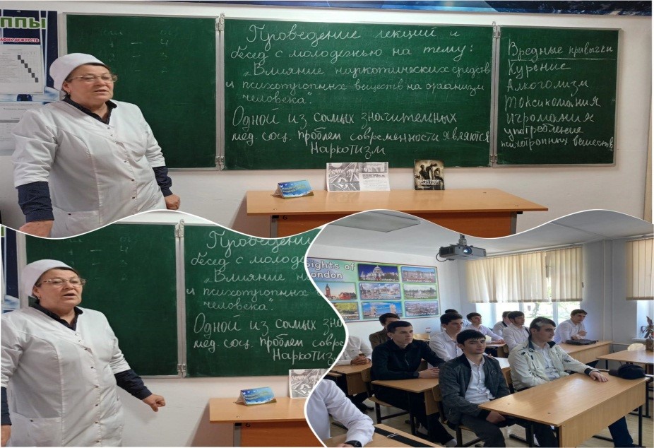 17.05.202217.05.2022 года в Курчалоевском государственном колледже имени Шахида Калиева медицинский работник колледжа Гапаева Малика провела беседу со студентами на тему: «Влияние наркотических средств и психотропных веществ