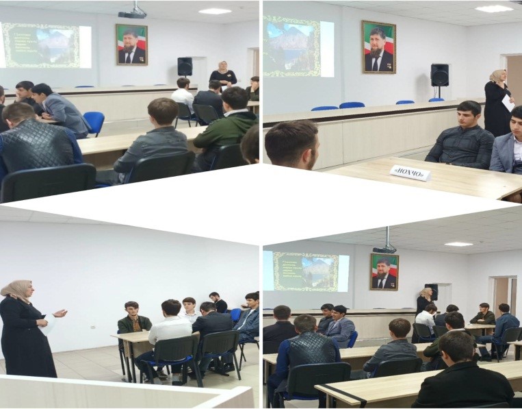 провела лекцию на тему: «Культура чеченского народа».Цель мероприятия - духовно-нравственного воспитания молодежи, популяризация традиций и обычаев чеченского народа, распространения традиционных национальных ценностей. В своем выступлении Шовхалова Луиза рассказала студентам, об истории чеченского народа и о том, в каких непростых условиях ему удалось сохранить свои традиции и культуру.Также она напомнила студентам о важности духовного развития, нравственных ценностях, культуре и их роли в становлении общества.