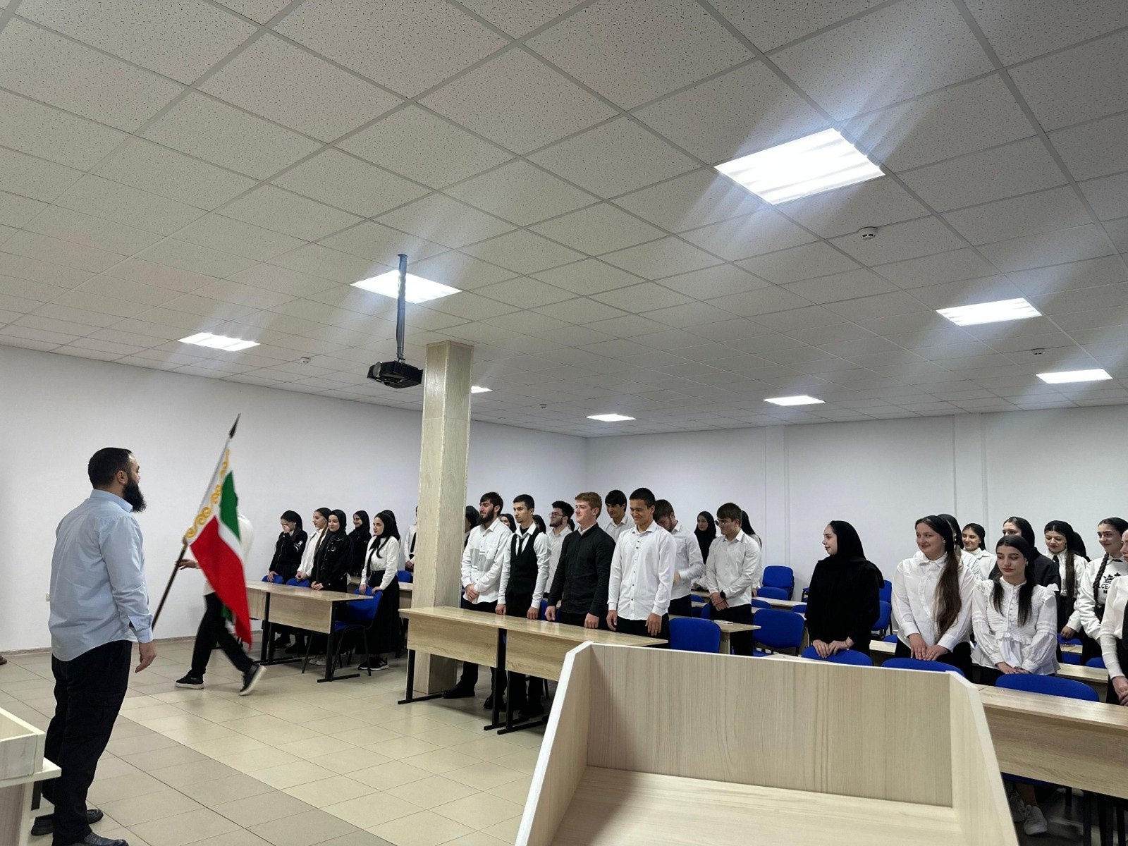 25.11.202425.11.2024 г. в ГБПОУ «КГК им. Ш. Калиева» прошла традиционная еженедельная линейка, которая началась с выноса государственного флага Российской Федерации и Чеченской Республики и исполнения гимна РФ и ЧР.Почётное право выноса и установления Флага предоставили студентам группы 22 МОЦИ 9-3 Б(к): Кадирову Хусайну Алихановичу и Баймурадову Шаабану Майр-Алиевичу.После линейки студенты разошлись по аудиториям на внеурочную деятельность «Разговоры о важном».
